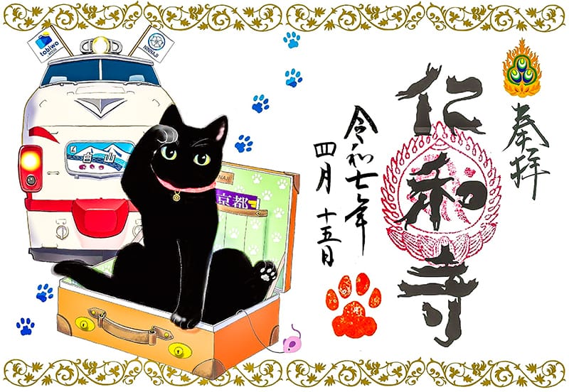 革の洋風スーツケースに入った仁和寺の黒猫と、国鉄特急 489系「白山」ボンネット車が、クソヤバ素敵に描かれた御朱印。