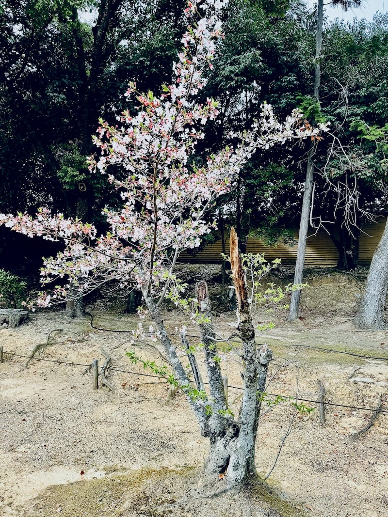 宝物館前の参道脇に桜が数本見られる。